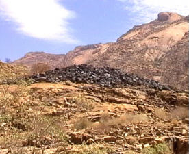 Den Brandberg, 30 km lang und 23 km breit, sieht man schon aus der Ferne. Die dunkle Farbe des grossen Monoliths kommt von dem sogenannten Wuestenlack. Das gewaltige Massiv ragt bis zu 2.000