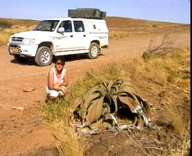 Welwitschia-Pflanze anzutreffen sein sollten (rechts) und uns die Strecke suedlich des Brandberg-Massivs im herrlichen Abendlicht als sehr einladend erschien.