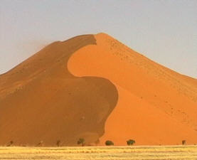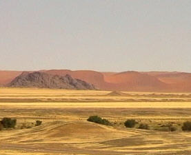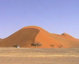 Vor langer Zeit suchte sich hier der Tsauchab Fluss seinen Weg durch die Duenen und bildete ein langes Tal. Heute fuehrt er - wenn ueberhaupt - nur so wenig Wasser mit sich, dass er spaetestens kurz vor Sossusvlei im Sand versickert.