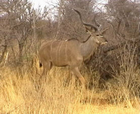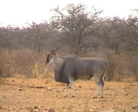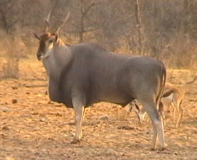 Elen-Antilope, die etwa mit einem ausgewachsenen Rind vergleichbar ist. Vor den groesseren, insbesondere der Oryx-Antilope, sollte man sich in Acht nehmen, da sie mit ihren Hoernen Menschen