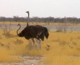 werden bis zu 2,50 m hoch. Da sie aeusserst wachsam sind, ist es schwierig, naeher an sie heranzukommen. Erwachsene Tiere laufen bis zu 65 km/h schnell.