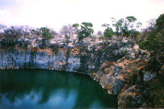 Vom Hoba-Meteorit aus ist es nur noch ein Katzensprung bis zum Etosha-Park, neben den beeindruckenden Duenen der Namib-Wueste wohl die Attraktion des Landes. Auf dem Weg dorthin, etwa 20 km noerdlich von Tsumeb, liegt der einst 55 Meter tiefe Otjikoto-See, dessen Pegel jedoch infolge Abpumpens fuer die Wasserversorgung von Tsumeb um etwa 20 Meter gesunken ist. Der See entstand einst durch Einsturz einer Hoehle.