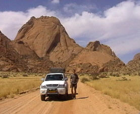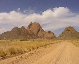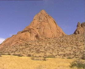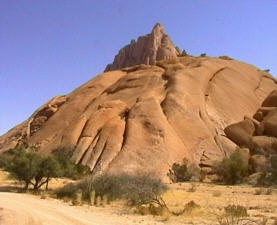 Etwa 50 km suedlich von Cape Cross geht es auf der D 1918 wieder ein Stueck landeinwaerts. Nach weiteren 90 km erreicht man die 1.728 m hohe Spitzkoppe, das Matterhorn Namibias.
