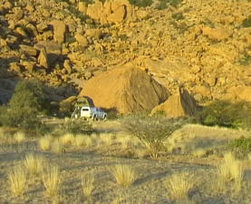 Die Spitzkoppe ist zwischenzeitlich eingezaeunt. Am Gate bezahlt man einen kleinen Eintritt fuer Besichtigung und Uebernachtung. Eine kleine Sandpiste, die in der Regel auch mit einem PKW