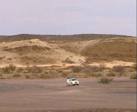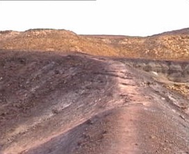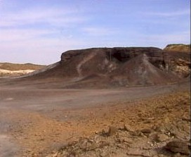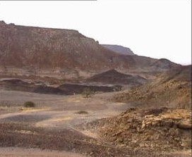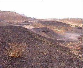 Etwa 20 Kilometer von Twyfelfontein entfernt befindet sich der Verbrannte Berg. Bereits auf dem Weg dorthin hat man das Gefuehl, man fuehre auf verbranntem Gestein, so schwarz ist dort die Strasse.