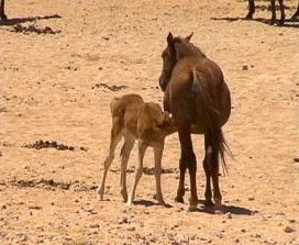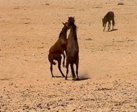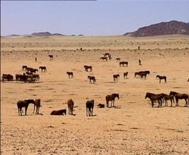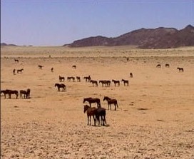 Zwischen Aus und Luederitz kommt man an einem Aussichtspunkt vorbei, an dem die Wildpferde der Namib beobachtet werden koennen. Man vermutet, dass diese einst zu dem Gestuet des Schlosses Duwisib gehoerten. Beeindruckend, wie sie sich innerhalb weniger Jahrzehnte an die Natur angepasst haben: die Beine sind kuerzer geworden und statt alle 3 Tage muessen die Wildpferde nur noch 1 Mal pro Woche trinken. Hierzu sind sie allerdings inzwischen auf eine kuenstliche Quelle angewiesen, die eigens fuer die Pferde geschaffen wurde, da die natuerlichen zwischenzeitlich ausgetrocknet sind.