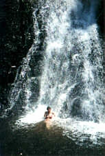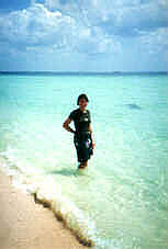(rechts) reichen vom Felsen bis zum smaragdgruenen Wasser hinab, dessen Temperatur etwa 32 Grad Celsius betraegt. Wenn man in das Meer hineingeht, ist
