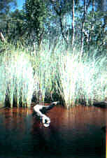 kommen eben und wird nur durch die gelegentlich vorbeischleichenden Boote aus dem Gleichgewicht gebracht. Hier sondert eine bestimmte Baumart Oele ab, so dass die Spiegelungen im Wasser rot