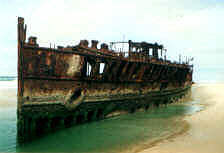 In der Mitte der Ostkueste liegt die 1935 auf Grund gelaufene „Maheno“, die inzwischen voellig verrostet ist. (Bild links)
