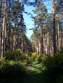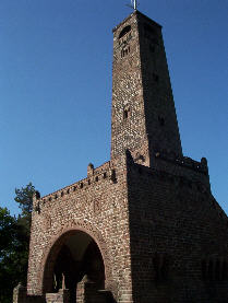 Nach Ueberqueren der Strasse bei Lindemannsruhe folgt man - am Bismarck-Turm (links) vorbei (welcher jedoch nur am Wochenende bestiegen werden kann) - der weiss-blauen Mar- kierung weiter bis zur Harden- burg (rechts).