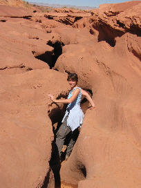 Zunaechst werden wir von einem Navajo-Indianer zum Eingang begleitet. Das ist auch besser so. Denn der Canyon ist so schmal, dass er in der Umgebung kaum auszumachen ist. Die Gefahr waere zu
